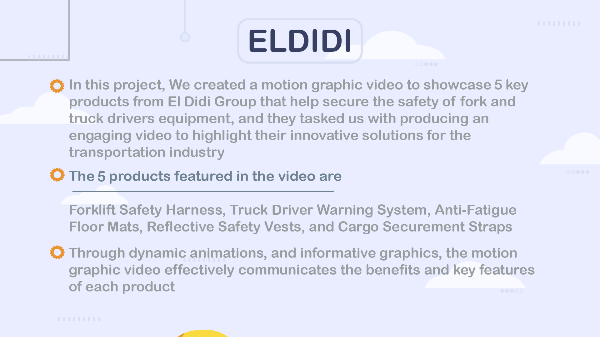 In this project, We created a motion graphic video to showcase key products from El Didi Group that help secure the safety of fork and truck drivers' equipment, and they tasked us with producing an engaging video to highlight their innovative solutions for the transportation industry